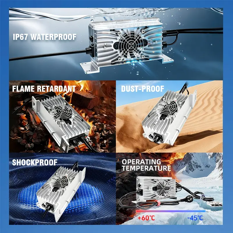 Пуно кућиште од легуре алуминијума побољшава ефикасност одвођења топлоте за 35% у поређењу са пластичним кућиштима, одржавајући радну температуру пуњача испод 60℃ током непрекидног рада од 1,2 кВ, чиме се штите унутрашње компоненте и продужава радни век. Поред тога, опремљен је вишеслојним сигурносним заштитним механизмима, укључујући заштиту од пренапона (55В мак), заштиту од прекомерне струје (28А мак), заштиту од кратког споја и заштиту од превисоке температуре, ефикасно спречавајући оштећење пуњача и батерије и осигуравајући безбедан рад у свим окружењима на возилу.