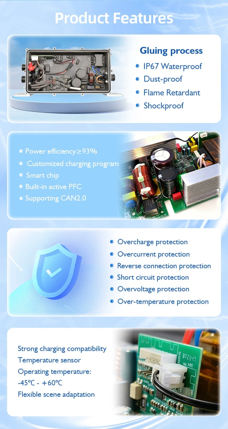 Са номиналном снагом од 1,2кВ и излазном струјом од 25А, овај уграђени пуњач батерија од 1,2кВ може у потпуности напунити батерију од 48В и 100Ах за само 4 сата, што је 20% брже од обичних пуњача од 1000В. Дизајн кола високе ефикасности смањује губитак енергије на мање од 10%, штедећи енергију уз истовремено брзо пуњење, што га чини идеалним за сценарије који захтевају брзо пуњење батерије.