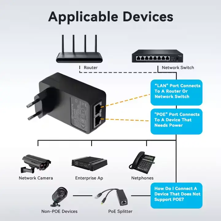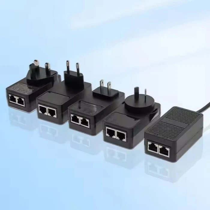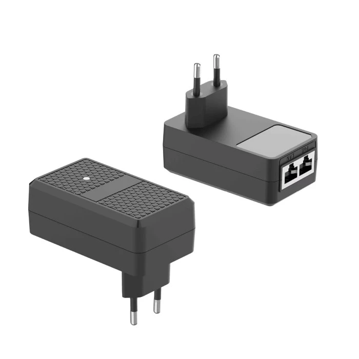 ПоЕ ињектор са измењивим утикачем од 12 В је интегрисани мрежни уређај за напајање који комбинује адаптер за напајање и пасивни ПоЕ ињектор у једну компактну јединицу. За разлику од традиционалних ПоЕ подешавања која захтевају и адаптер за напајање и модул ињектора, овај дизајн поједностављује инсталацију омогућавајући да се уређај директно монтира на зидну утичницу.