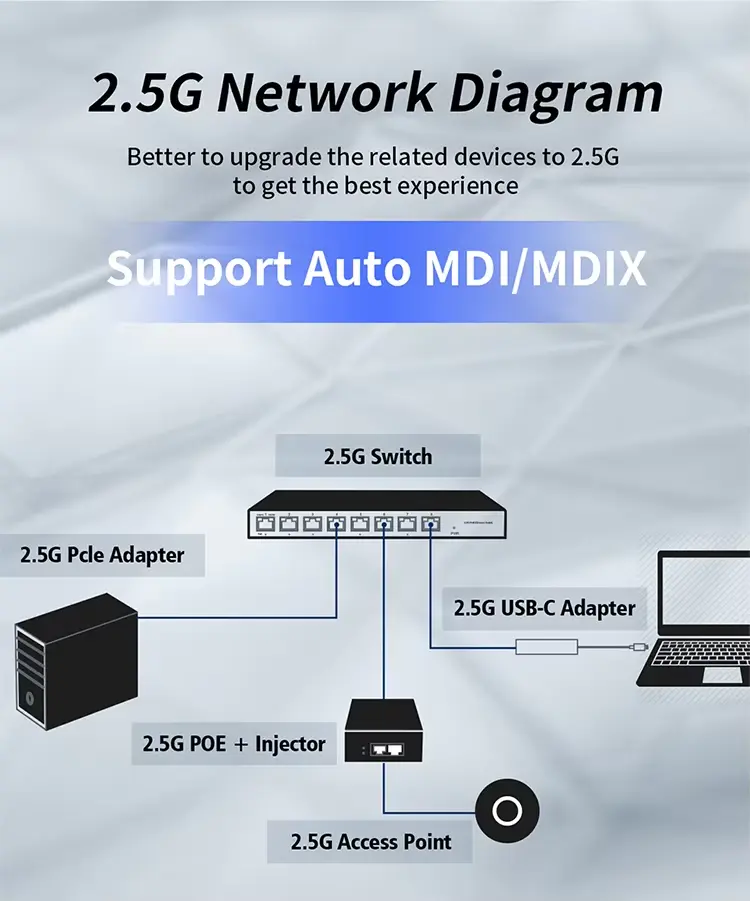 Останите испред криве пропусног опсега уз подршку за брзине преноса података од 2,5 Гбпс, потпуно уназад компатибилан са 10/100/1000 Мбпс уређајима.