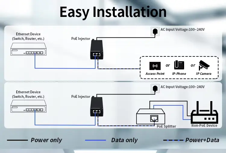 Компатибилност са напајањем: Компатибилан са ИЕЕЕ802.3аф (15,4В), ИЕЕЕ802.3ат (30В), па чак и ИЕЕЕ802.3бт (90В) / ПоЕ++ (60В) уређајима.