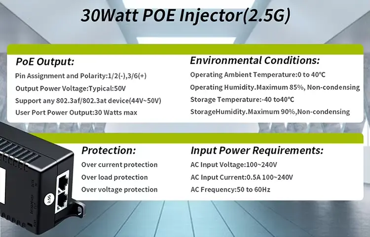 Овај Пое ињектор од 30 В подржава више ПоЕ стандарда, што га чини флексибилним избором за различите уређаје.