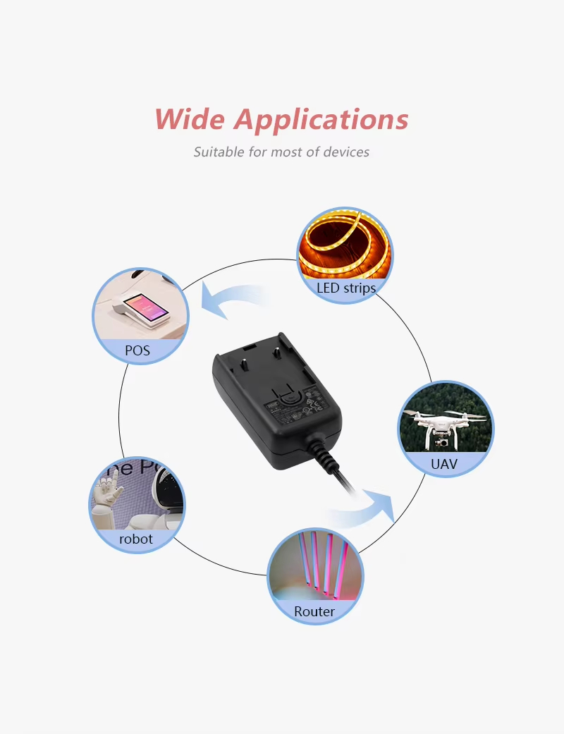 Ефикасно и стабилно напајање: Као адаптер за напајање од 24В високих перформанси, он усваја напредну технологију напајања са измењивим утикачем за постизање ефикасне конверзије. Може стабилно да конвертује наизменичну струју у једносмерну (АЦ на ДЦ измењиви адаптер за напајање), пружајући континуирану и чисту енергију за ваше уређаје.