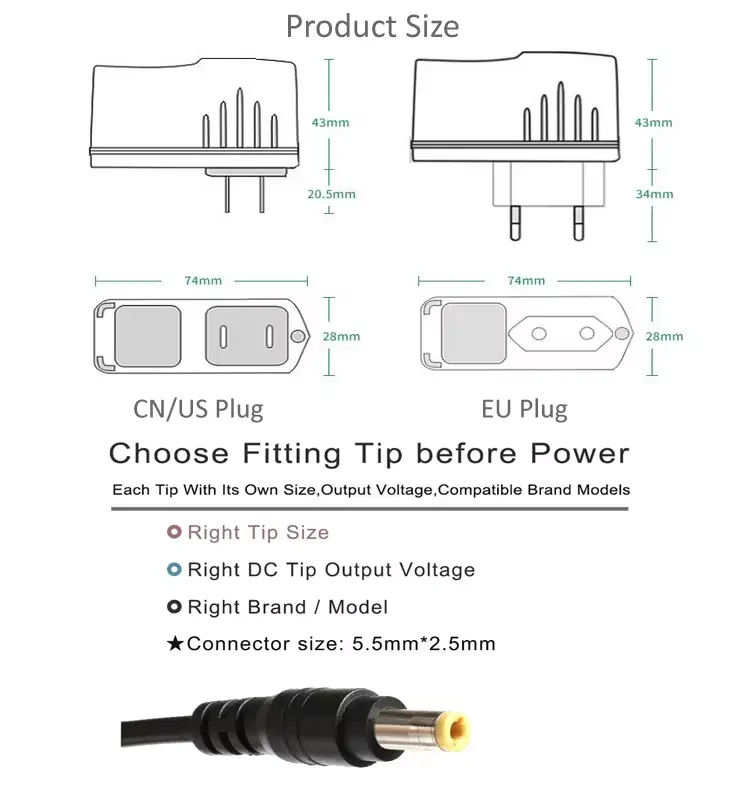 Утикач за наизменичну струју: УС/ЕУ/АУ/УК/ЦН/ЈП утикачи су заменљиви