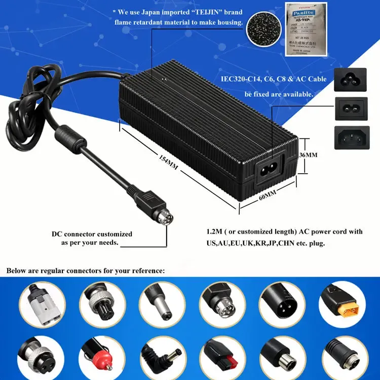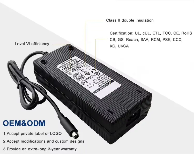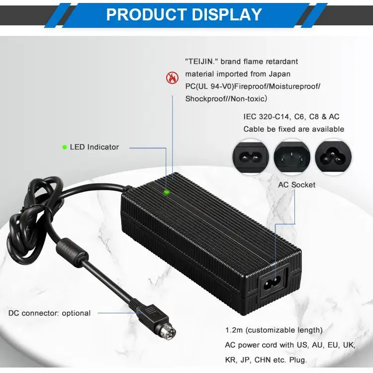 Глобална компатибилност и флексибилан дизајн: Направљен са универзалним опсом улаза наизменичне струје од 100–240ВАЦ, 50/60Хз, овај пуњач подржава употребу широм света. Нуди више опција за улаз наизменичне струје (ИЕЦ320-Ц14, Ц6, Ц8) и долази са 1,2М каблом за напајање који се може прилагодити помоћу америчких, АУ, ЕУ, УК, КР, ЈП, ЦХН и других регионалних утикача. Кућиште је направљено од ПЦ ватроотпорног материјала, што обезбеђује издржљивост и безбедност у различитим условима рада.