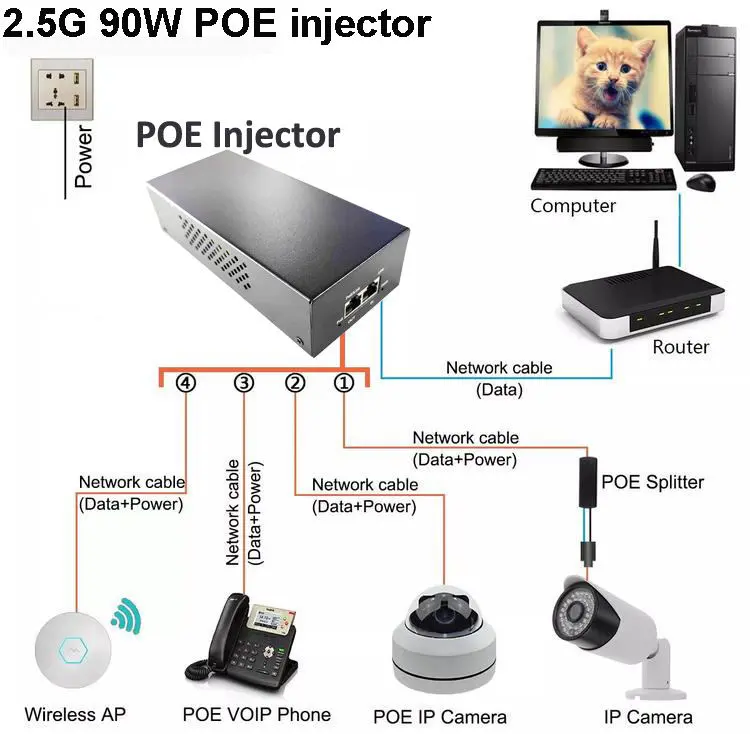Старвелл фабрички 48В 90В ПоЕ ињектор ПоЕ адаптер, решење високих перформанси дизајнирано за поуздано напајање и испоруку података преко Етхернета. Потпуно усклађен са ИЕЕЕ802.3аф/ат/бт ПоЕ++ стандардима, овај ињектор осигурава стабилан пренос података велике брзине 2.5Г и може напајати уређаје високе потражње као што су ИП камере, бежичне приступне тачке, мрежни прекидачи и ИП терминали. Његов компактан, плуг-анд-плаи дизајн поједностављује инсталацију у кућним, канцеларијским и индустријским мрежама, нудећи безбедно и ефикасно ПоЕ напајање уз минимално подешавање.