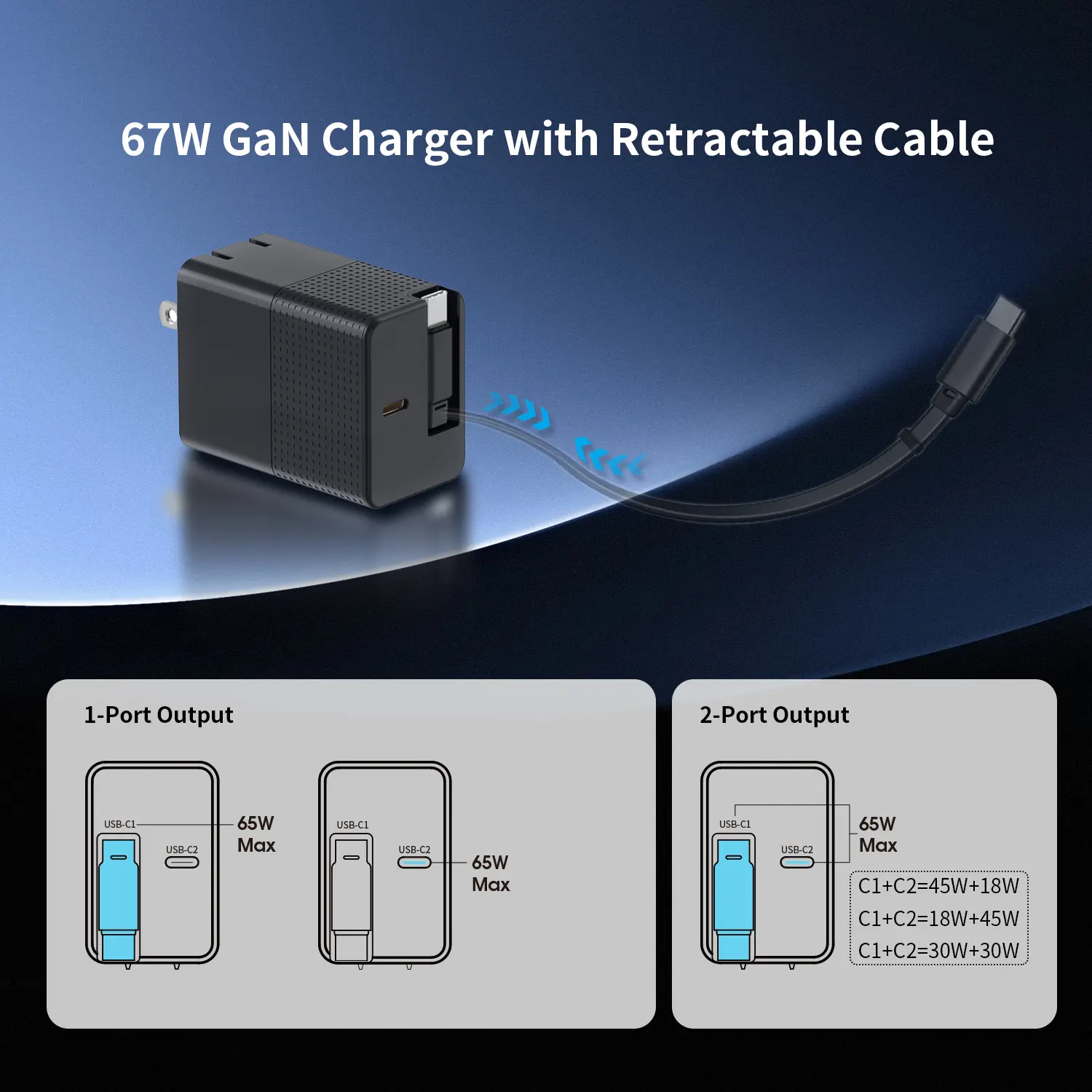 Двоструки УСБ-Ц портови: ПД 3.0 пуњач од 65 В може пунити два уређаја истовремено. Током процеса два пуњења, снага се додељује као 45В и 20В.