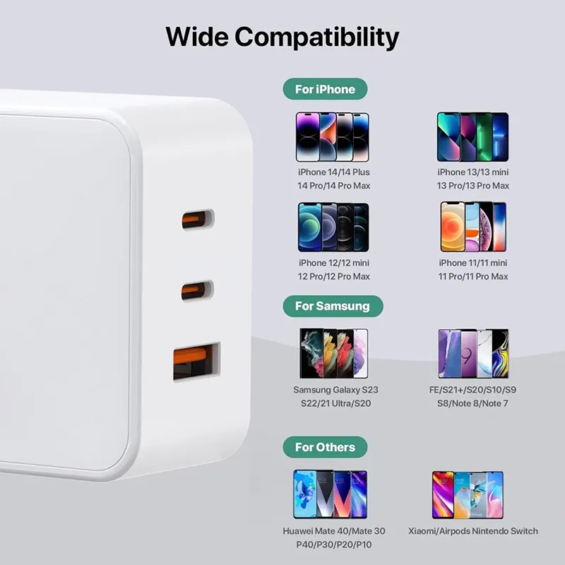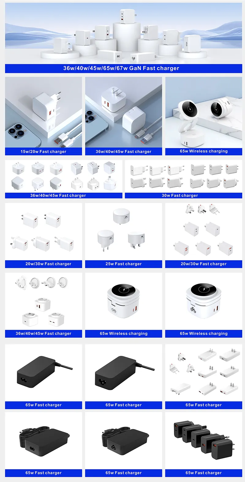 Овај пуњач испоручује до 65В конзистентне снаге и ефикасно пуни лаптоп рачунаре (нпр. МацБоок Аир/Про, Делл КСПС), таблете, паметне телефоне (иПхоне, Самсунг Галаки) и друге уређаје који подржавају ПД протокол. Његов компактан и лаган дизајн чини га идеалним за путовања, док уграђена заштита од пренапона, струје и кратког споја осигурава безбедно пуњење пуњача и повезаних уређаја. Обично је опремљен са 1-2 УСБ-Ц интерфејса, који подржава пуњење више малих уређаја у исто време, балансирајући снагу и удобност.