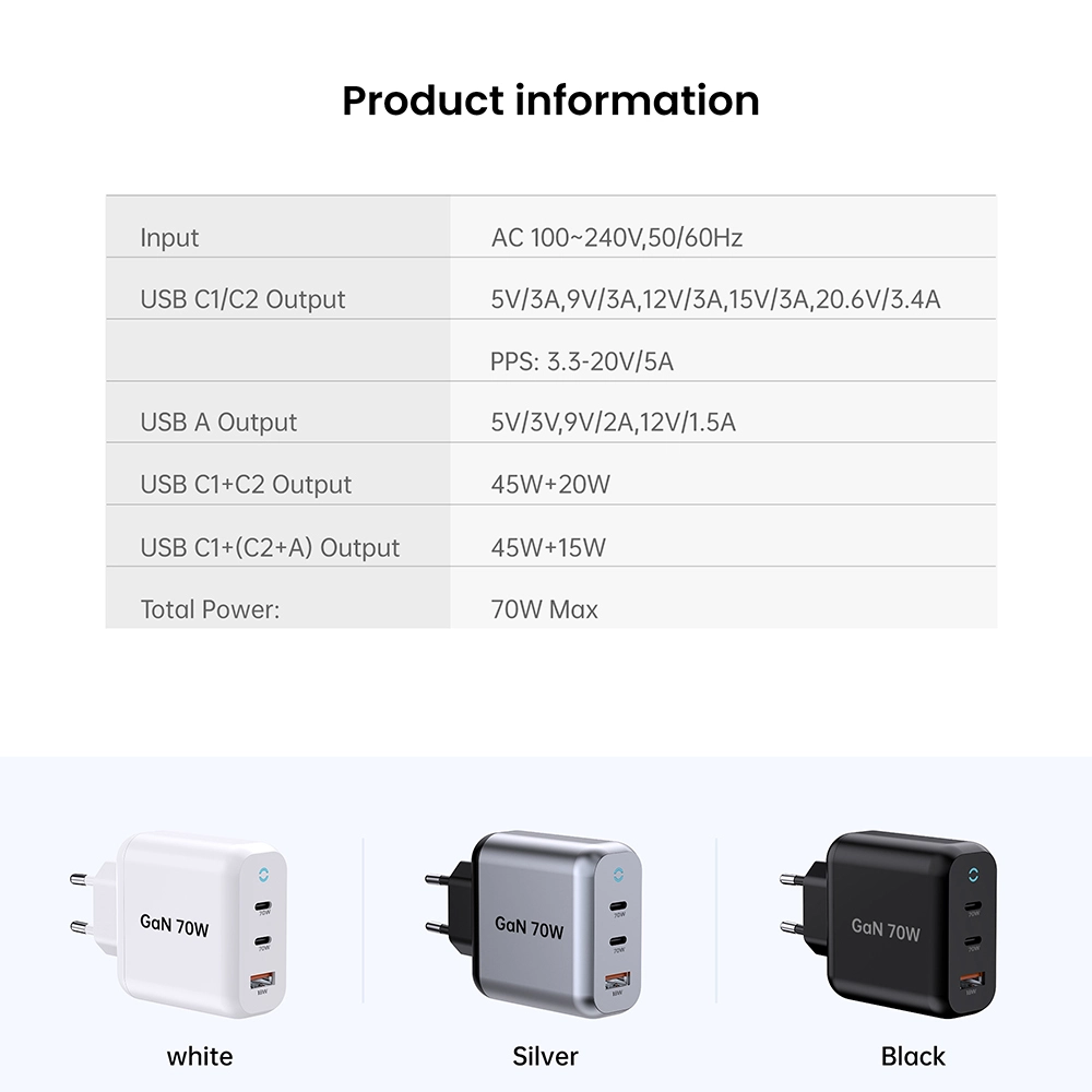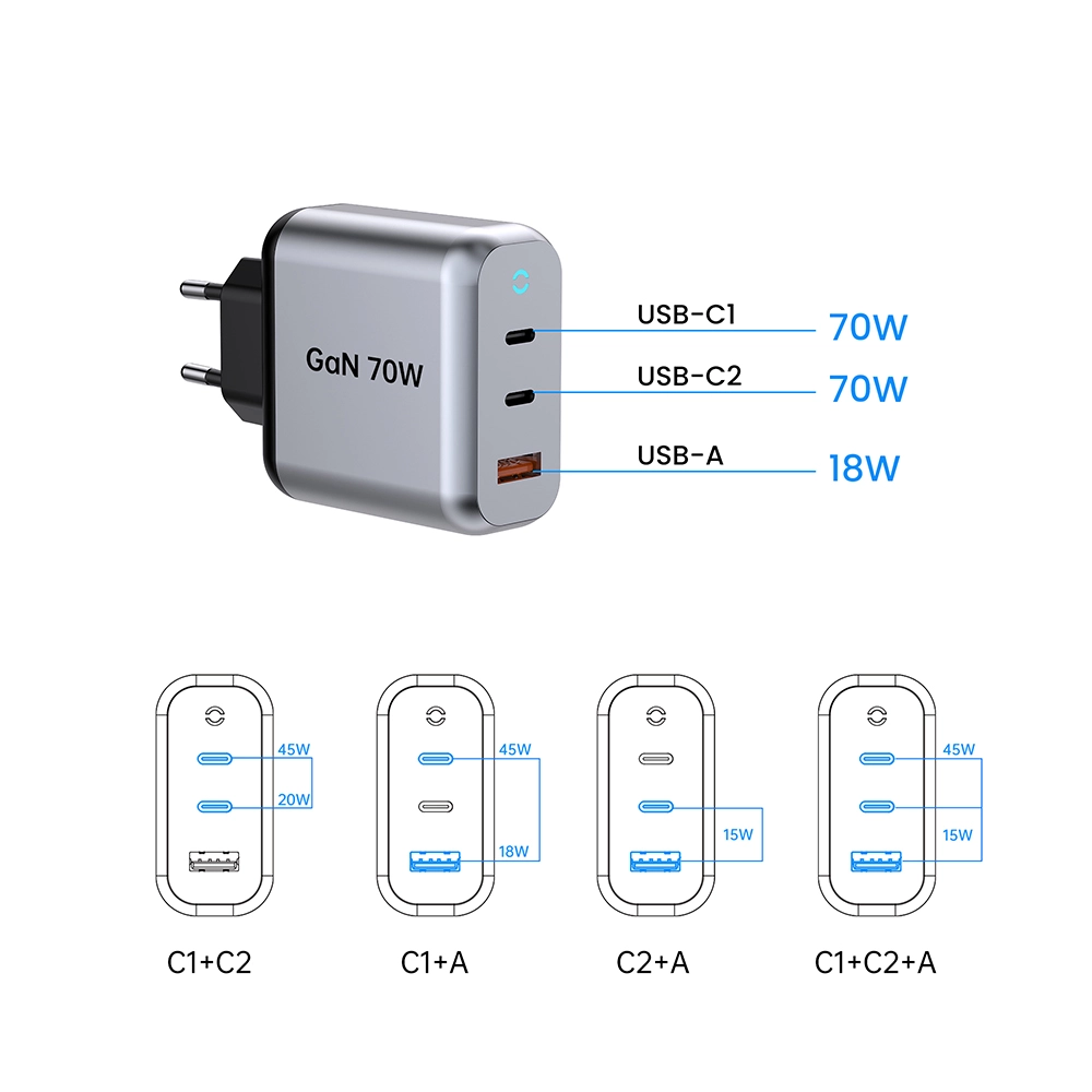 Ц1/Ц2 Излаз: 5В3А,9В3А,12В3А,15В3А,20.6В3.4А (70В мак) ППС: 3.3-11В 4.05А УСБ-А излаз: 5В3А,9В2А,12В1.5А 3.3-11В 2А (22В макс.) Ц1+Ц2 Излаз: 45В+20В Ц1+Ц2+УСБ-А Излаз: 45В+5В3А Укупно:70В |