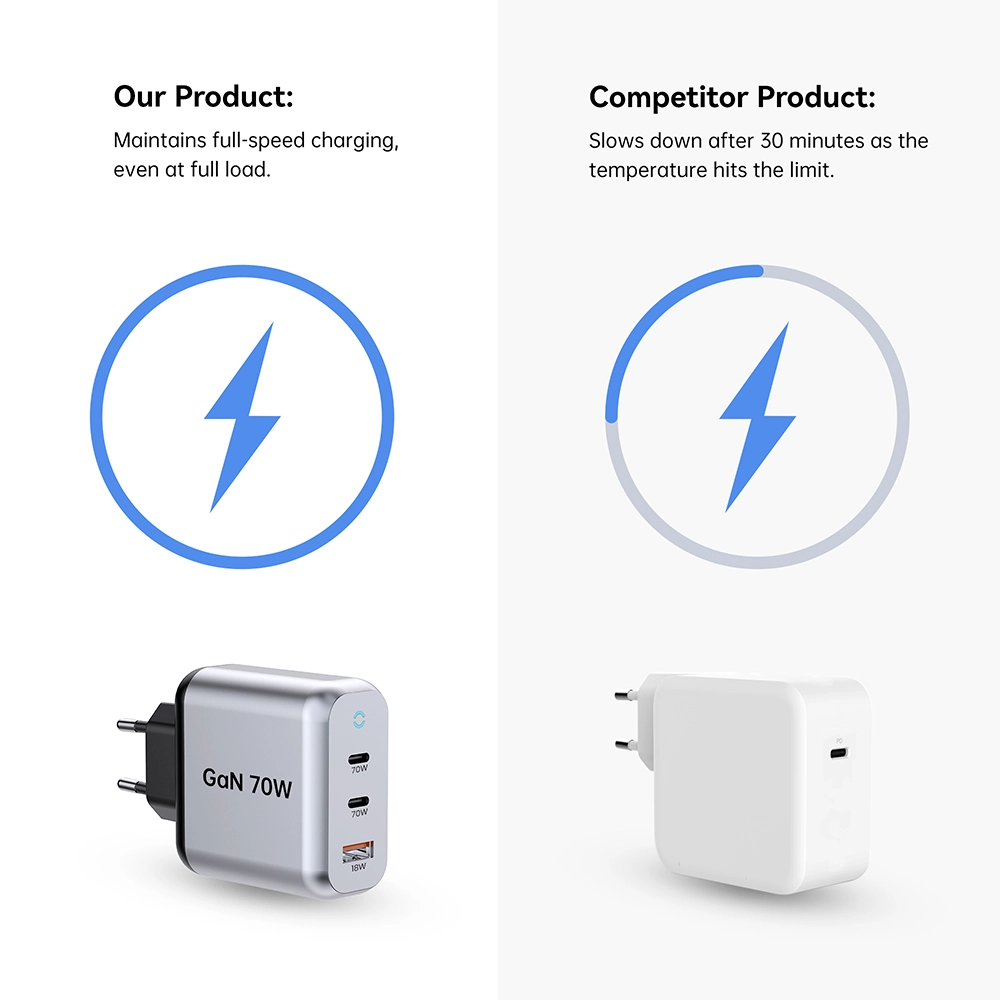 Старвелл издржљиви ПД пуњач од 70В који се такође назива 70В ГаН брзи пуњач: 2Ц1А, задовољава дневне потребе за брзим пуњењем мобилних телефона и таблет уређаја. Мале величине, јаке перформансе, са напредном технологијом галијум нитрида. Када се користи у једном порту, максимална излазна снага УСБ-Ц1 интерфејса је 70В. Када се два порта користе заједно, УСБ-Ц1 и даље одржава 45В ПД брзо пуњење. Подржава више протокола брзог пуњења, укључујући ПД3.0, ППС, КЦ4+ и КЦ3.0, обезбеђујући широку компатибилност са различитим уређајима