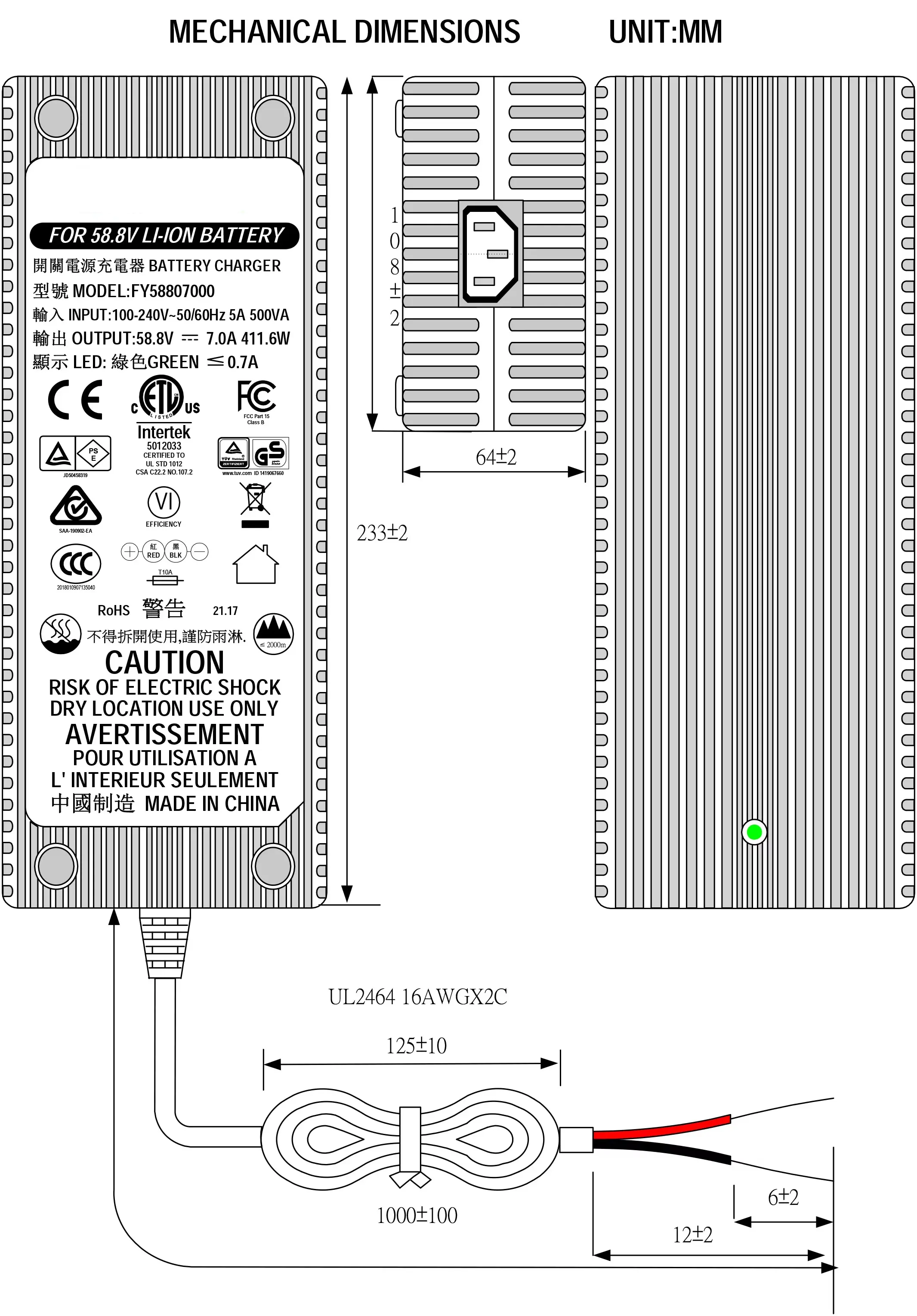 Сертификован у складу са стандардима УЛ, ЕТЛ, ЦУЛ, ГС, ЦЕ, БС, САА, КЦ, ПСЕ, ЦБ, ФЦЦ, ЕМЦ, РоХС, РЕАЦХ, овај пуњач пружа ефикасну, брзу и безбедну снагу за захтевне апликације за електричну мобилност.