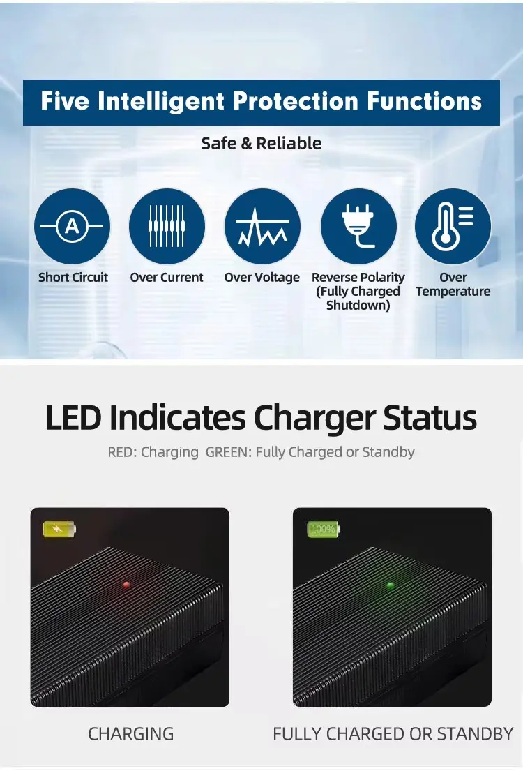 Глобална компатибилност и робусна безбедност: Са универзалним улазом од 100–240 ВАЦ, ради беспрекорно широм света. Напредно тростепено паметно пуњење (ЦЦ/ЦВ) оптимизује здравље батерије, док свеобухватна заштита — укључујући кратак спој, пренапон, превисоку температуру и преоптерећење — обезбеђује безбедан рад без бриге. Издржљиво кућиште је направљено од ватроотпорних материјала за повећану поузданост у захтевним окружењима.