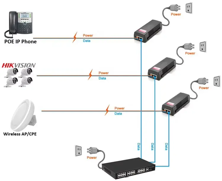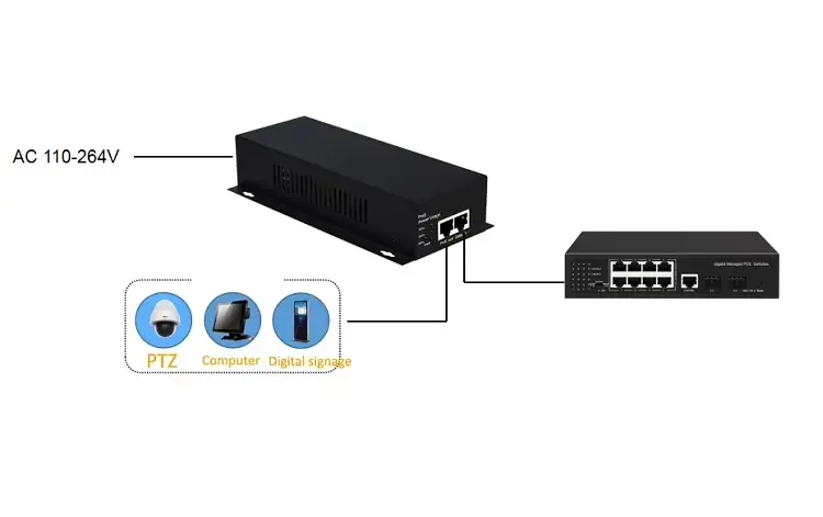 Захтеви за каблирање: За испоруку пуне снаге 90В на дужим удаљеностима (до 100м), врло се препоручује да користите Цат6а (или новији) Етхернет кабл да бисте смањили губитак енергије и стварање топлоте.