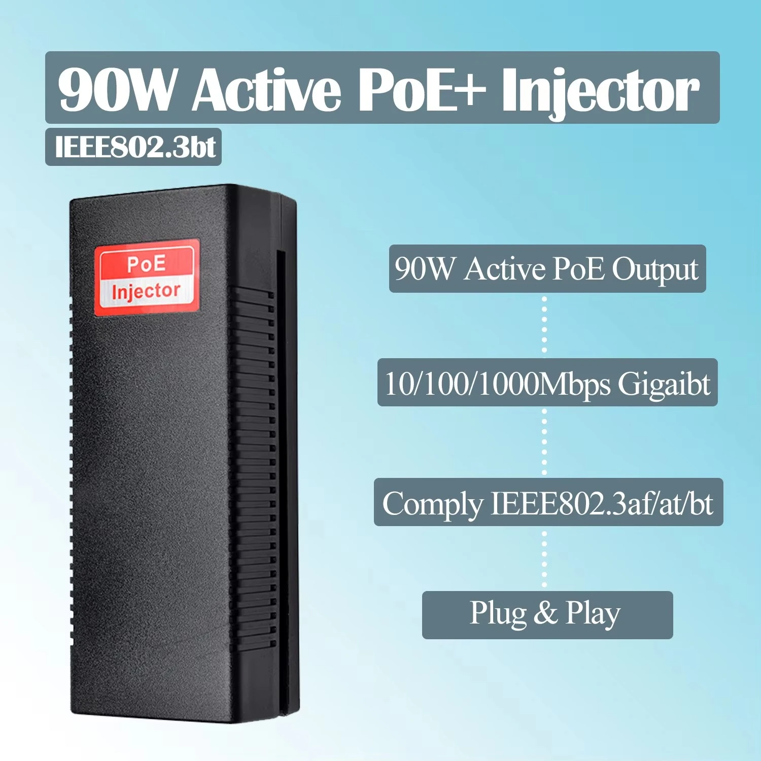 Као професионални произвођач напајања у Кини, Старвелл представља активни 90В ПоЕ ињектор, који подржава и активни и пасивни режим. Опремљен интелигентним колом за детекцију снаге, аутоматски идентификује потребе за напајањем повезаних уређаја и прилагођава свој излаз у складу са тим; штавише, његов уграђени механизам заштите од квара обезбеђује сигурност нестандардних терминала.