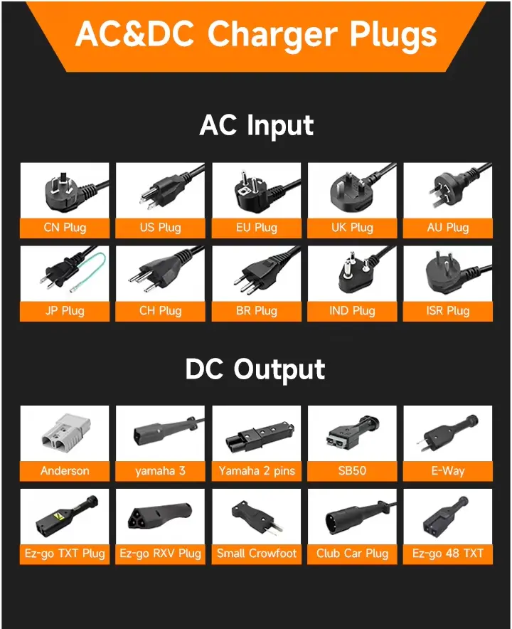 ЕУ утикач, обично за земље ЕУ као што су Немачка, Француска, Холандија, Данска, Аустрија, Шведска итд. Утикач за УК, обично за Британију, Индију, Пакистан, Сингапур итд. АУ утикач, обично за Аустралију, Нови Зеланд, Аргентину итд. Уобичајени ДЦ конектори на тржишту укључују Андерсон, ЕЗ-го, ДС Цлуб Цар и Иамаха конектор, итд.