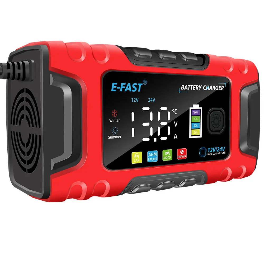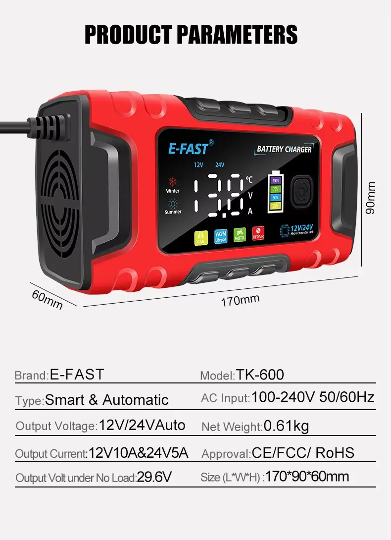 Висококвалитетни Е-Фаст ТК-600 потпуно аутоматски са технологијом пулсне поправке 12В10А 24В5А оловно-киселински лифепо4 пуњач за аутомобиле |